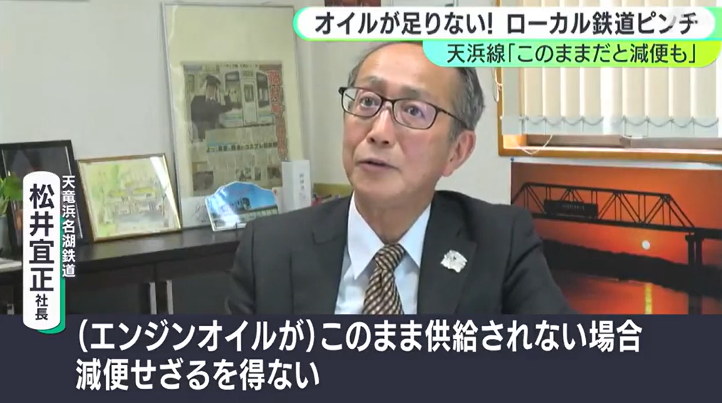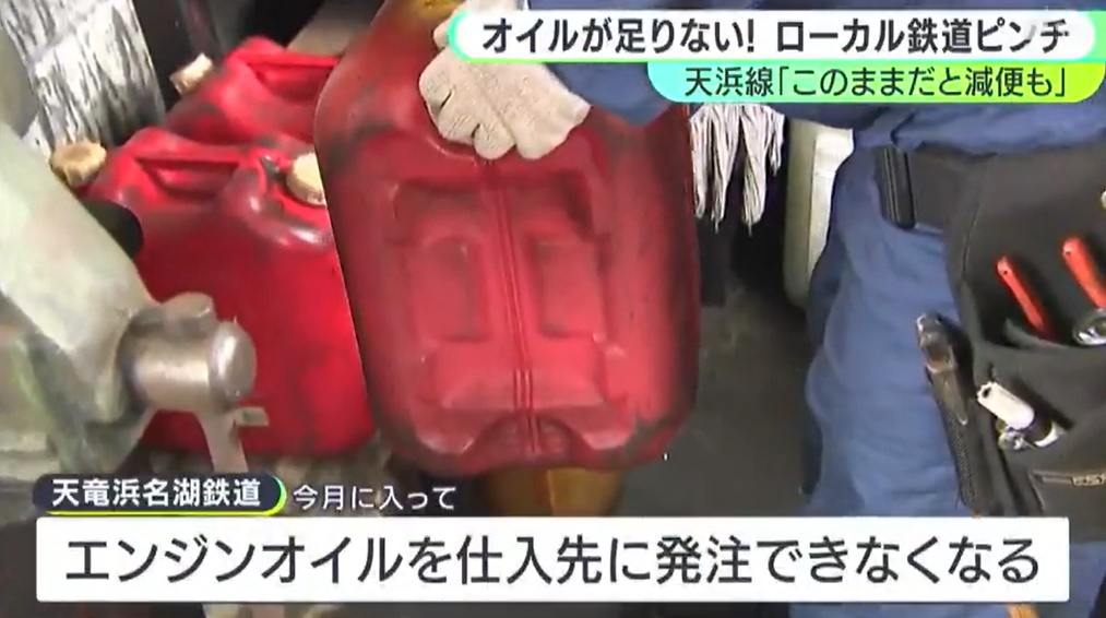 @Friends_quail「ドラム缶にはあと1両分しか入っていない」ディーゼル列車の“心臓”守るエンジンオイルが足りない 減便の可能性も… イラン情勢の影響がローカル鉄道にも >>静岡県西部を走る天竜浜名湖鉄道で、車両の運行に欠かせないオイルが残りわずかとなり、このままでは、運行に影響… newsdig.tbs.co.jp/articles/sbs/2…