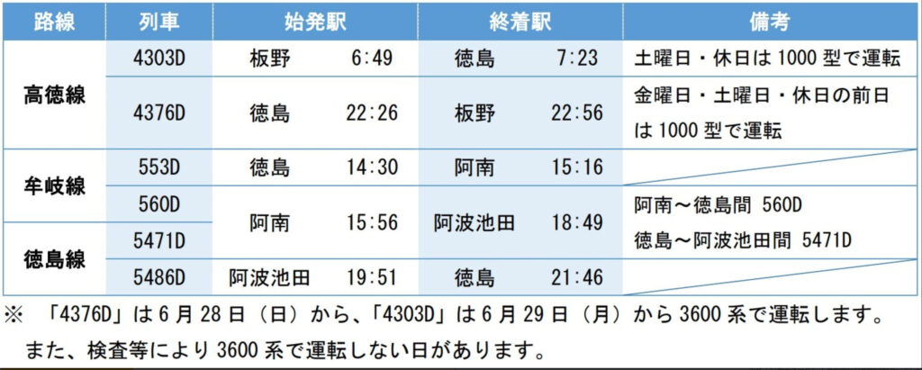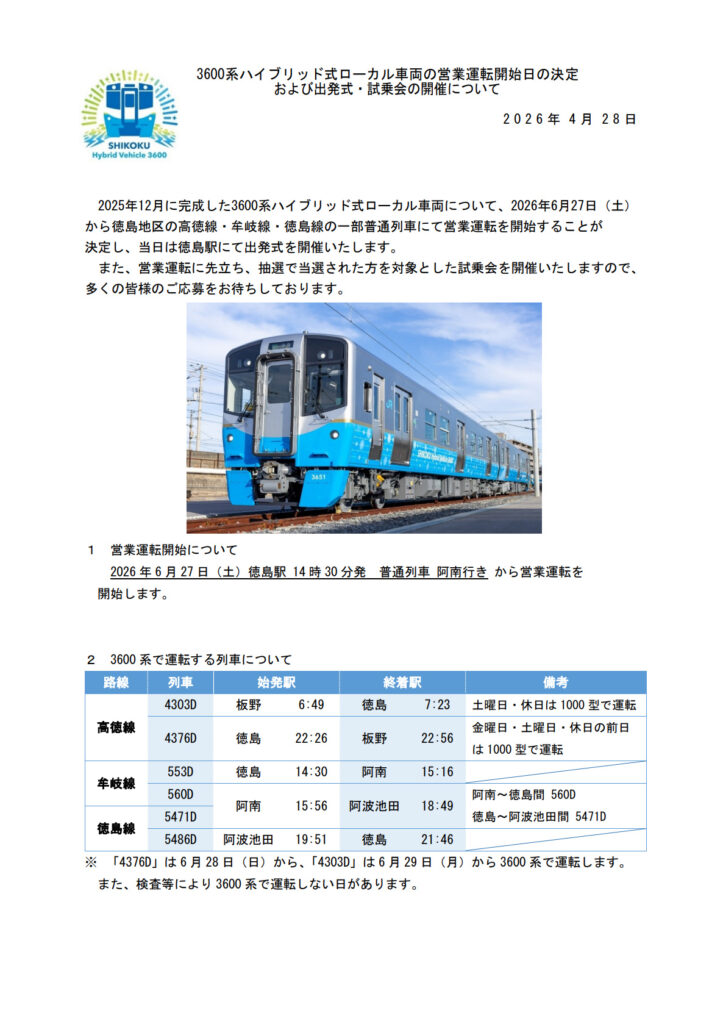 @kbrkohrki2『6月27日は、徳島駅14時30分発の牟岐線阿南駅行き列車より運転。以降、徳島駅を中心とした、高徳線、牟岐線、徳島線の列車で、固定ダイヤで運転します。』 JR四国初のハイブリッド車両「3600系」、6月27日にデビュー (鉄道コム) tetsudo.com/news/4048/