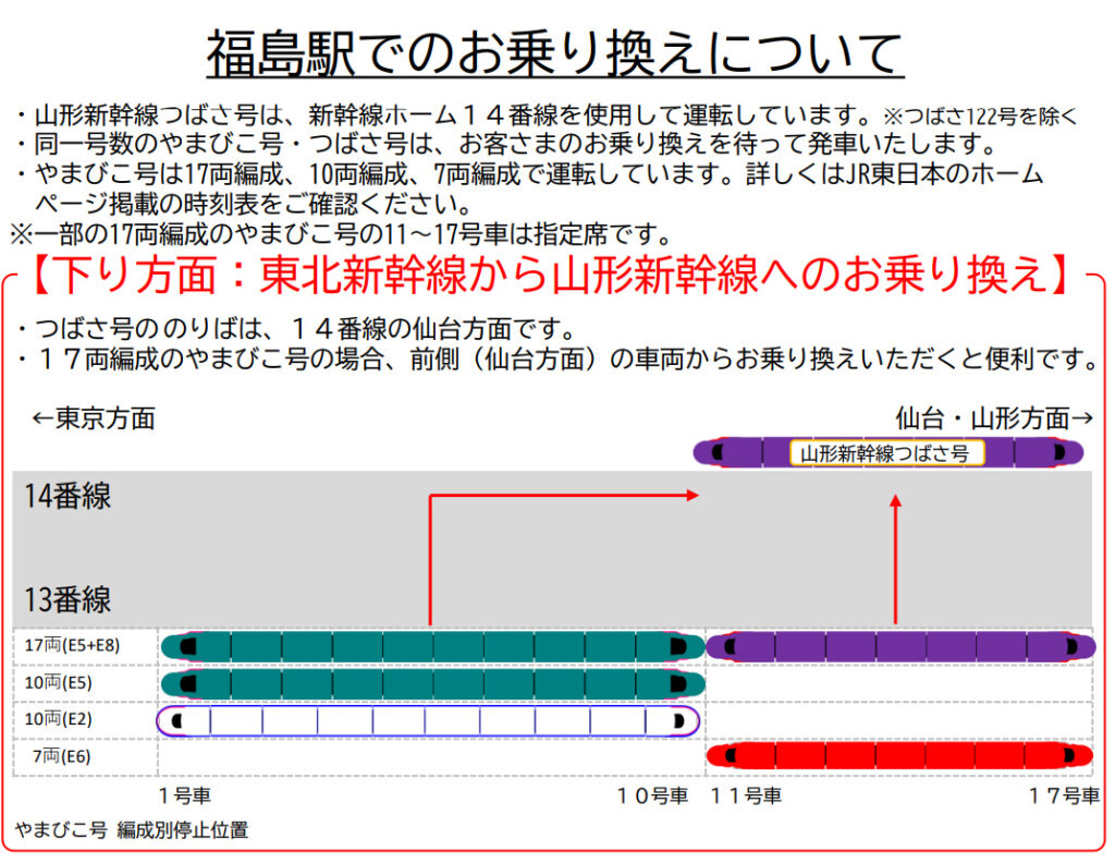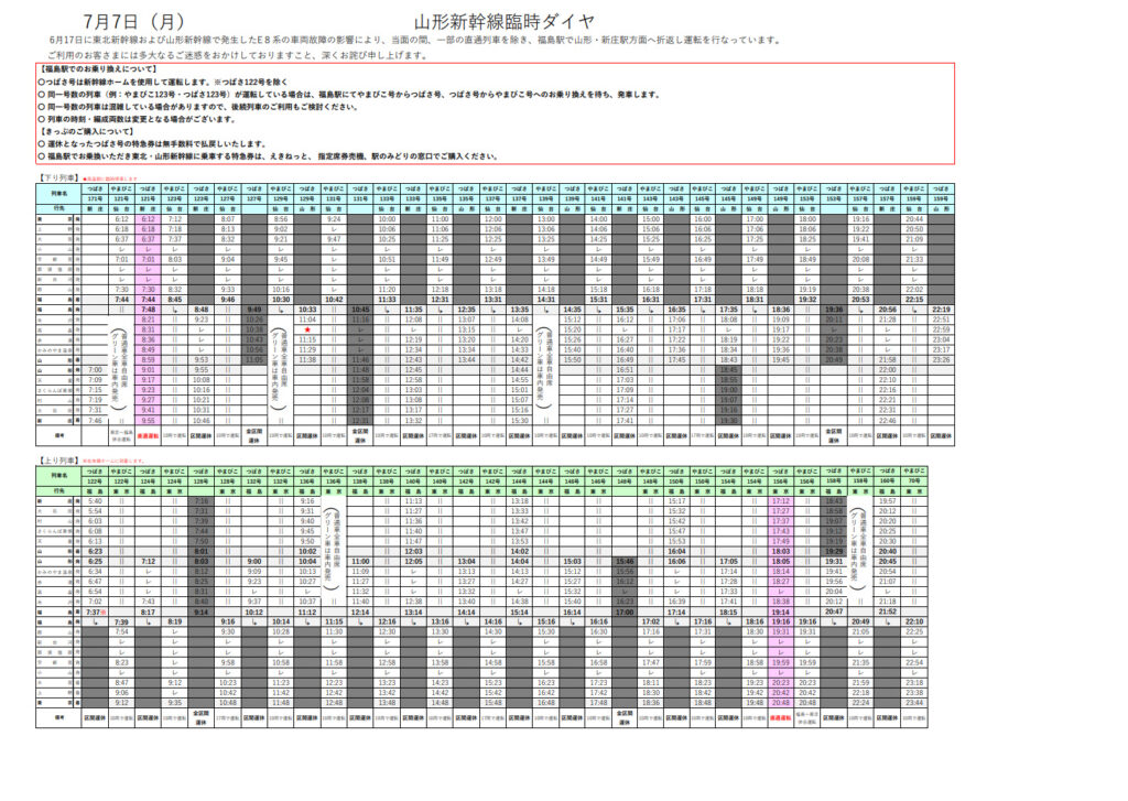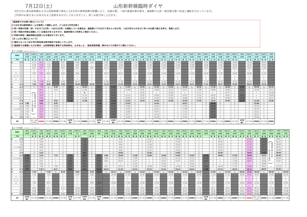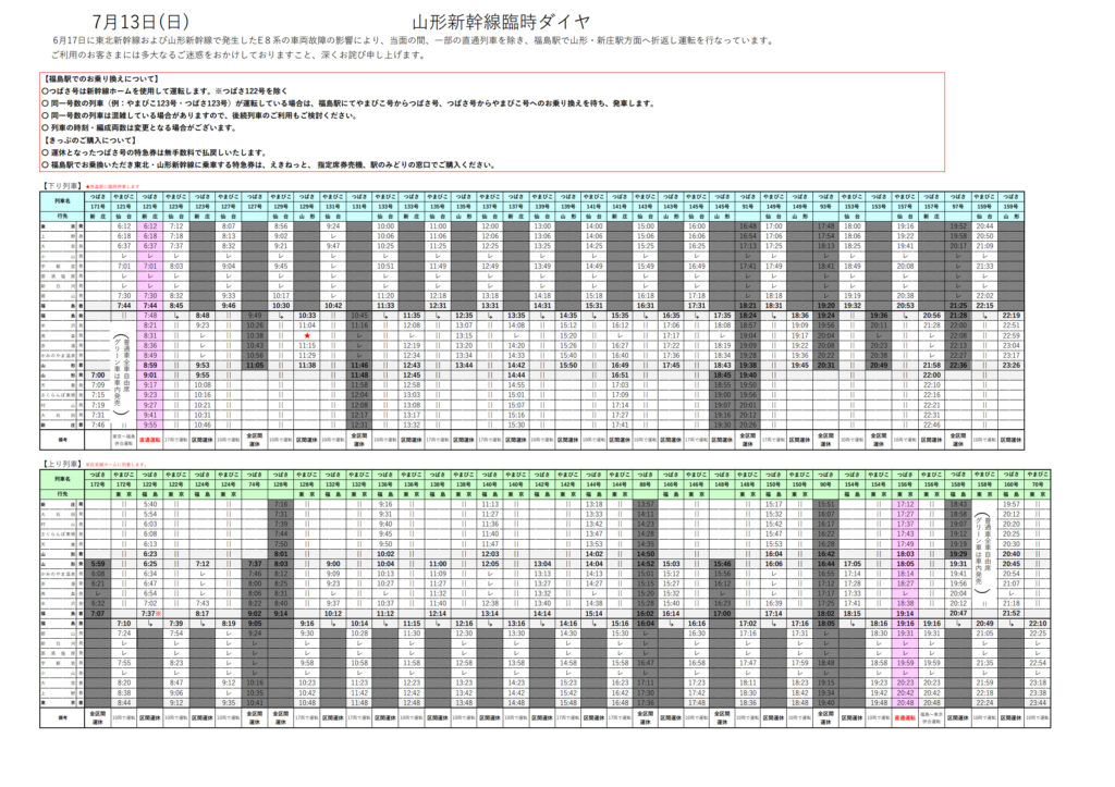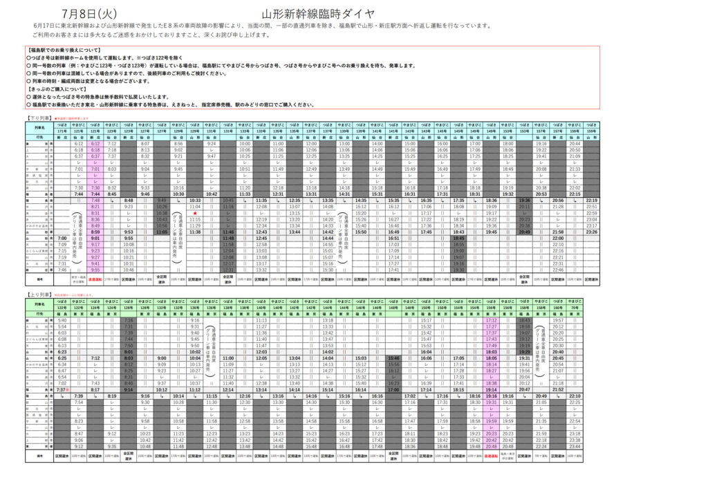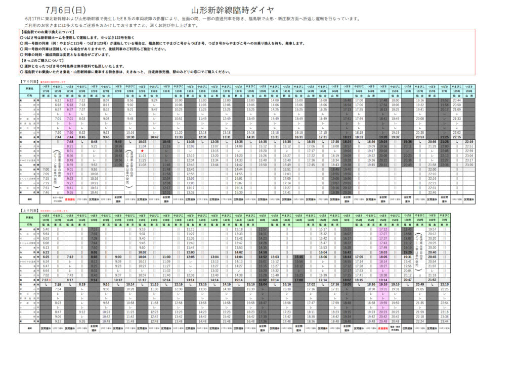 山形新幹線は、6/17日に発生した山形新幹線のE8系車両故障の影響で、一部列車を除き、福島駅で折り返し運転をします。
