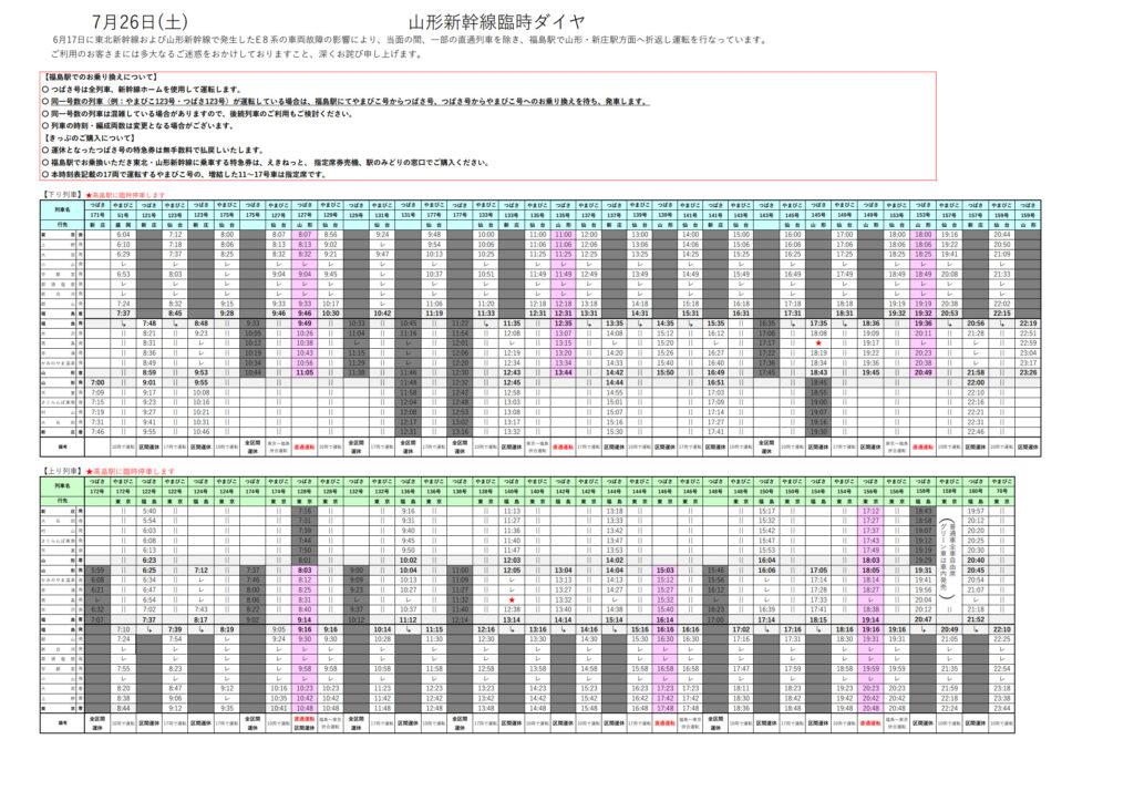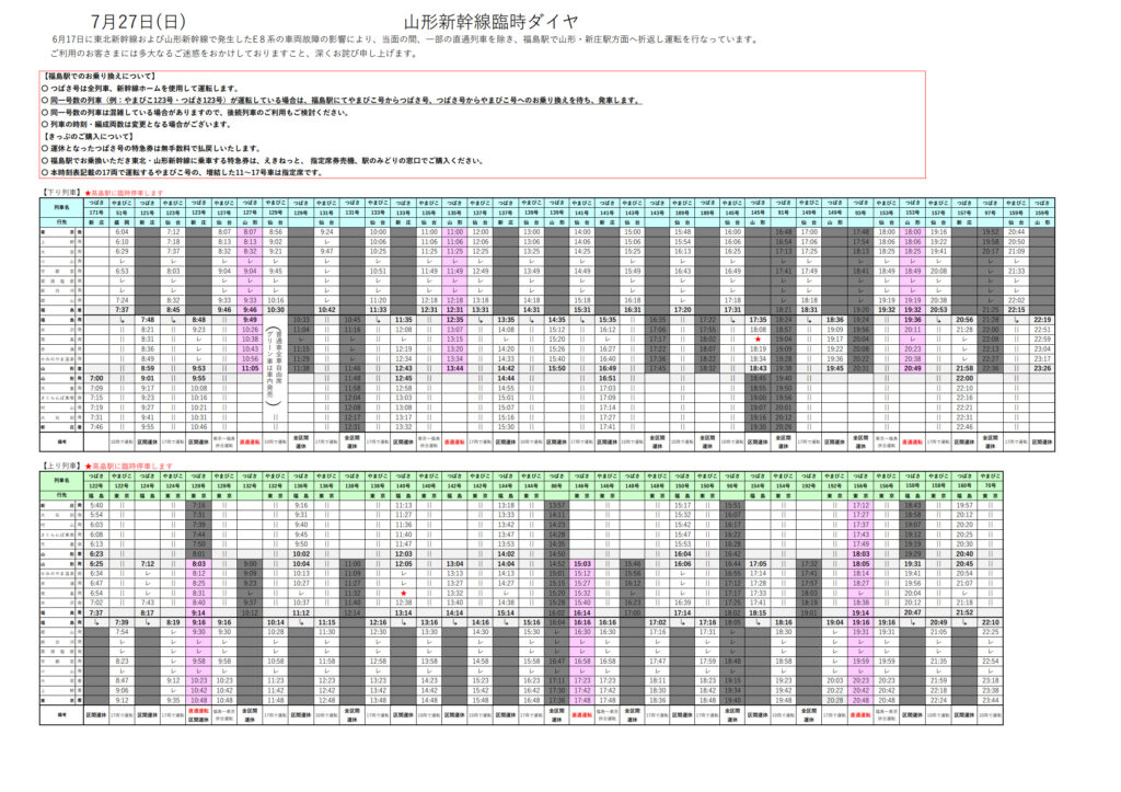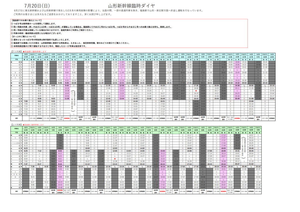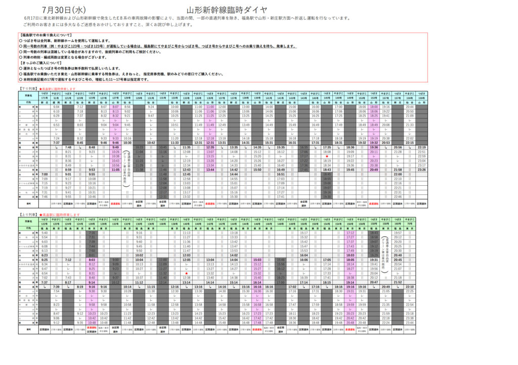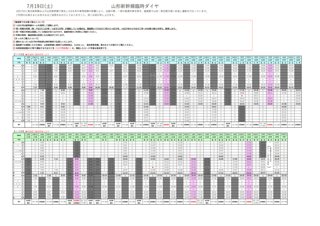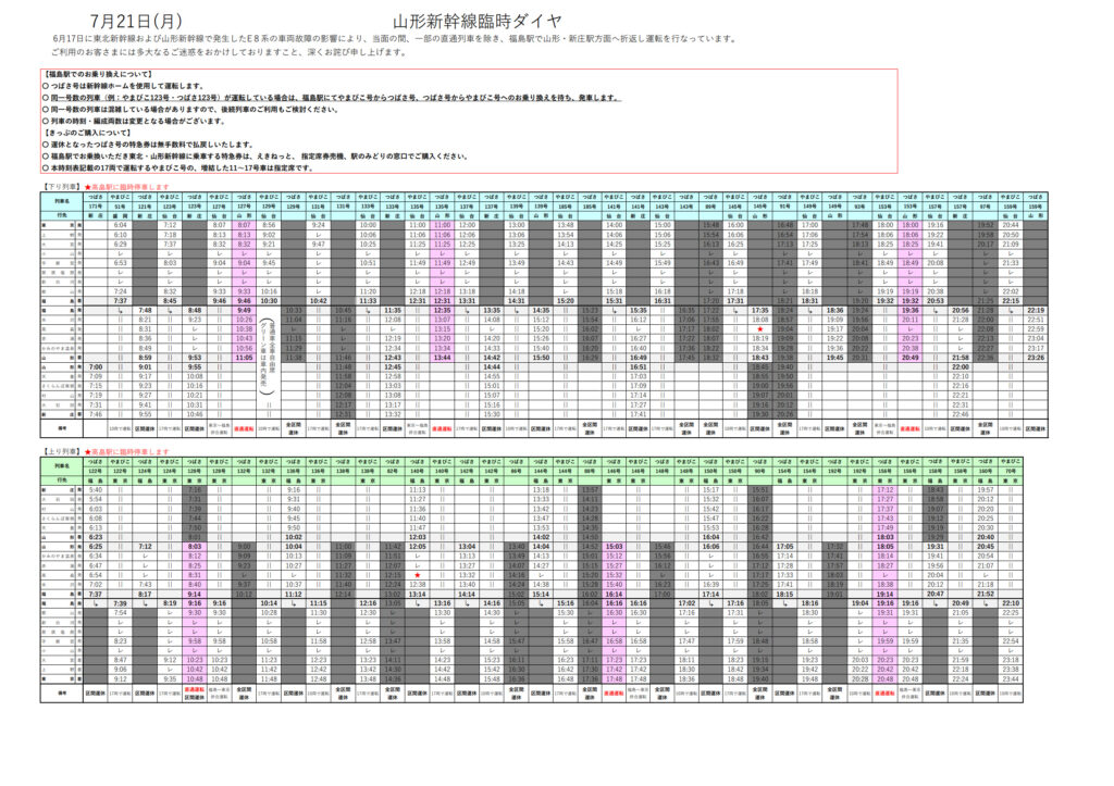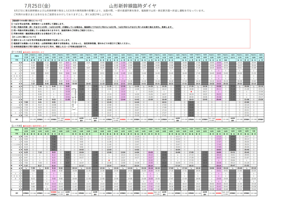 北海道・東北・秋田・山形・上越・北陸新幹線(ニュース 新幹線) 新幹線(ニュース 新幹線) 鉄道ニュース速報 山形新幹線運転計画 7/18~31 7/19から直通3往復に増便!大半が福島折り返し!運休有! 2025年7月18日 2025年7月30日 あいえす Facebook postはてブLINEPocket 山形新幹線は、6/17日に発生した山形新幹線のE8系車両故障の影響で、一部列車を除き、福島駅で折り返し運転をします。 山形新幹線の7/18日~31日の運転計画は、下記のとおりです。 (出典:https://www.jreast.co.jp/) ピックアップ記事 スポンサードリンク Facebook postはてブLINEPocket