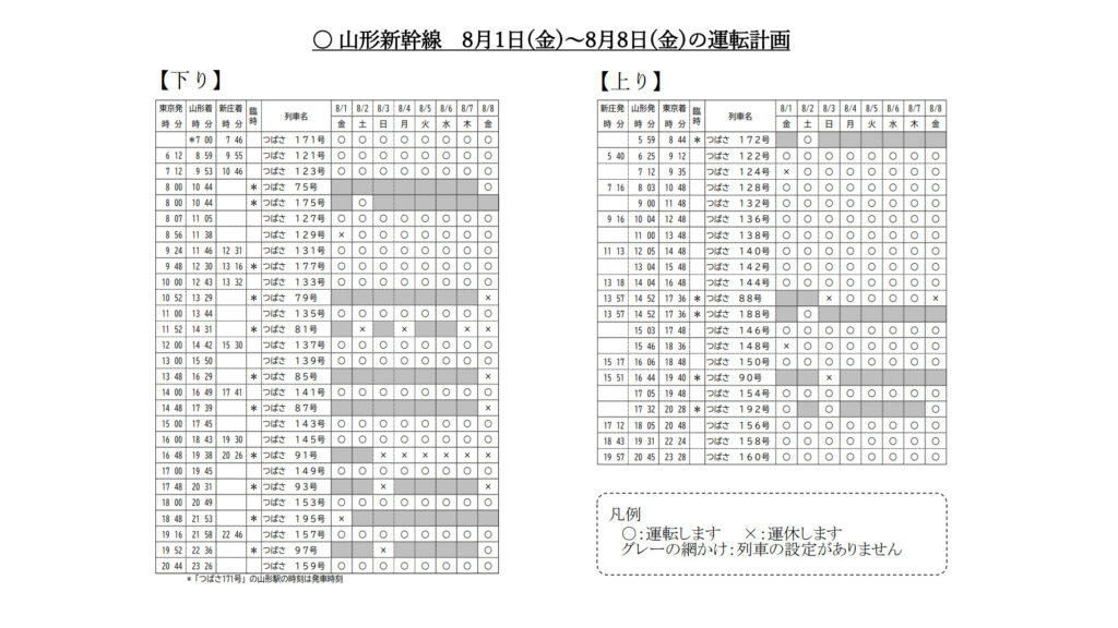 北海道・東北・秋田・山形・上越・北陸新幹線(ニュース 新幹線) 新幹線(ニュース 新幹線) 鉄道ニュース速報 山形新幹線8/1から直通運転再開! 8/1~8の運転計画 2025年7月23日 2025年7月30日 あいえす Facebook postはてブLINEPocket 画像> (出典 newsdig.ismcdn.jp) (出典 fnn.ismcdn.jp) (出典 www.toretabi.jp) (出典 upload.wikimedia.org) (出典:https://www.jreast.co.jp/) <関連する動画> <ツイッターの反応> ピックアップ記事 スポンサードリンク Facebook postはてブLINEPocket