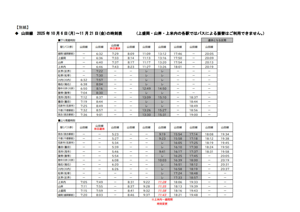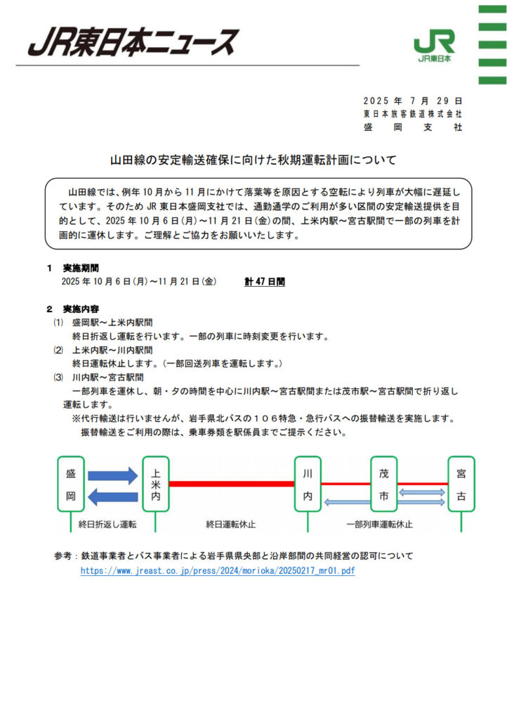 @Belkis7073落ち葉のせいで進まない… JR山田線上米内ー宮古の一部列車、10~11月に計画運休 iwate-np.co.jp/article/2025/7…